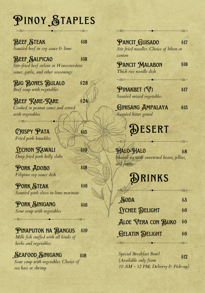 The beverage choices complement the food well, with traditional juices like Calamansi or Pineapple providing a subtly sweet, tangy refreshment that pairs nicely with the savory dishes. Whether visiting for a hearty dinner, an afternoon treat, or their weekend breakfast buffet, the menu reflects a blend of familiar comforts and fresh ingredients, creating an inviting space for everyday enjoyment.